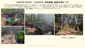 【10月8日の報告】育林祭植樹会場の整備を実施しました。伐採した立木の枝葉を一カ所に集め、19日の会員協働作業でチップにする予定です。