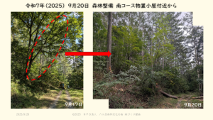 根元を蟻が巣食って危険な立木は伐採し、枝が折れ垂れ下がり散策路に落ちそうな立木は、その下を通らないように、三角コーンを設置しています。後半の作業班の危険木処理は、南コース脇の立木を中心に伐採していきます。