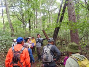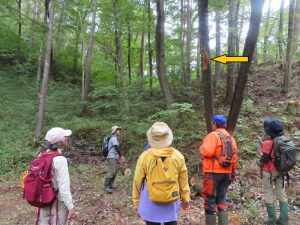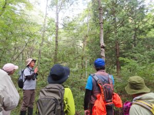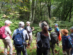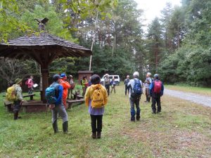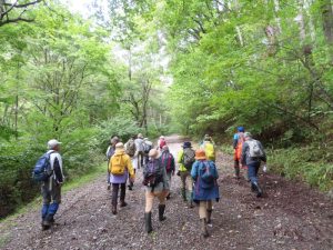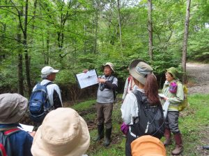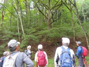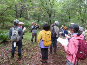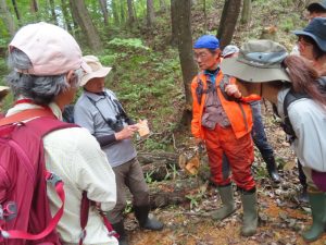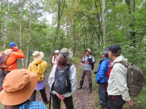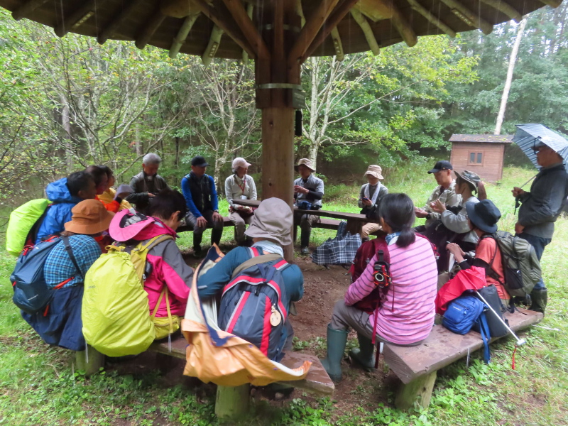 12時過ぎに池に着いた時にも、13時から雨の予報が変わらなかったので、参加者の皆さんと相談して、池での昼食を我慢して、早めに南コースを駐車場に向かうことにしました。それでも、南コース半ばで雨となりましが、雨の中でも説明が必要な箇所で説明を受けながら進み、14時、駐車場に戻りました。