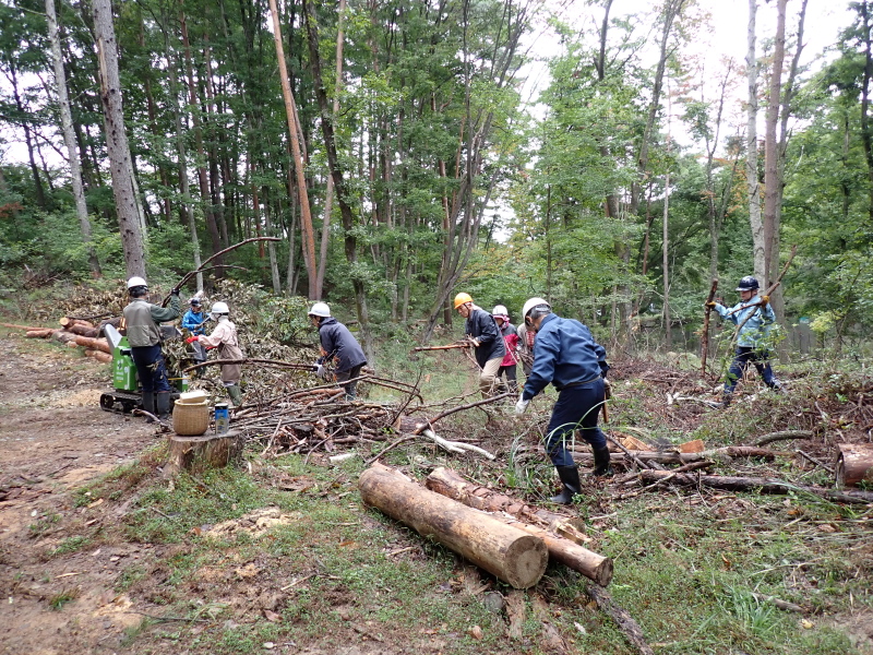 集合時間前にチッパーを載せた吉江車が、市民の森に入った砂利道でタイヤがパンクし、参加者が協力してスペアタイヤに交換するというトラブルがありました。