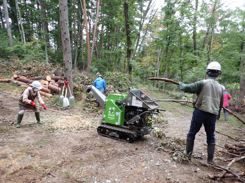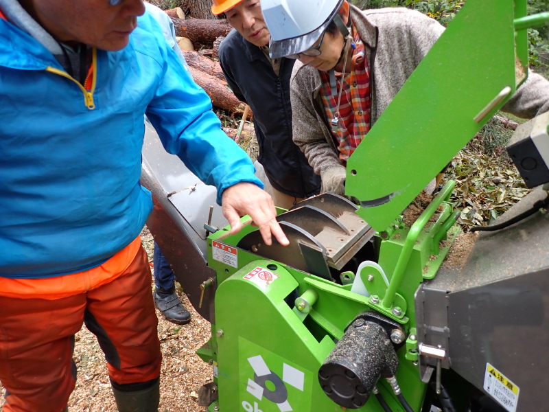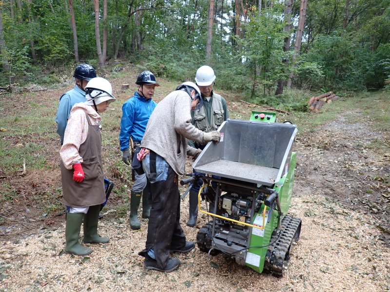 休憩時間には、チッパーの管理部門を森林観察学習部会から、森づくり部会に変更することになっているので、操作方法の説明を行い、実際に操作もしてもらいました。