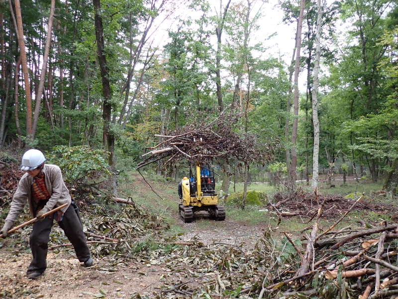9時時点の雨雲レーダでは、時々霧雨程度の雨と思われるので実施と決めました。幸い実施時間中、作業に支障があるほどの雨はなく、東コース入口付近の残枝を集め、チップにして路面に敷きました。