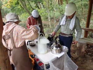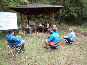 作業の後は、池の四阿付近で昼食をとり、黒曜石の水で入れた美味しいコーヒーを飲みながらの懇親。話題は飛び飛びで気軽な話し合いでした。参加者はいつも会うメンバーだったので、日頃、活動に参加されない方が気軽に参加できるイベントにしていく必要があると感じました。